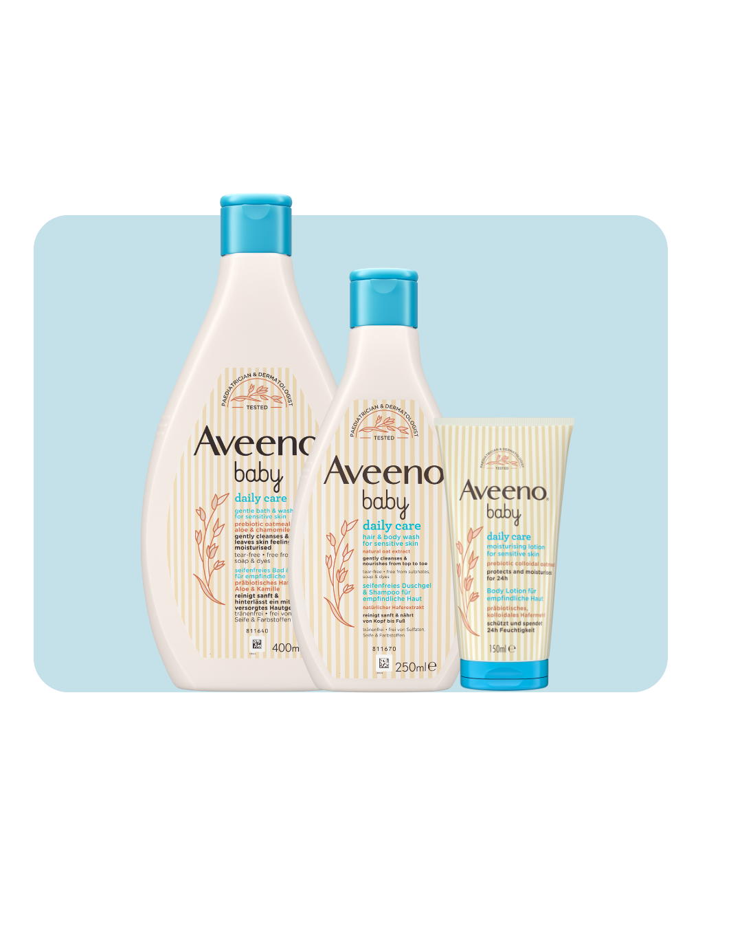 Die Aveeno® Baby Produktreihe wurde entwickelt, um zu reinigen, zu schützen und bereits bei der ersten Anwendung zu nähren. Sie eignet sich für verschiedene Hautbedürfnisse und bietet Formulierungen, die für empfindliche Babyhaut geeignet sind.
