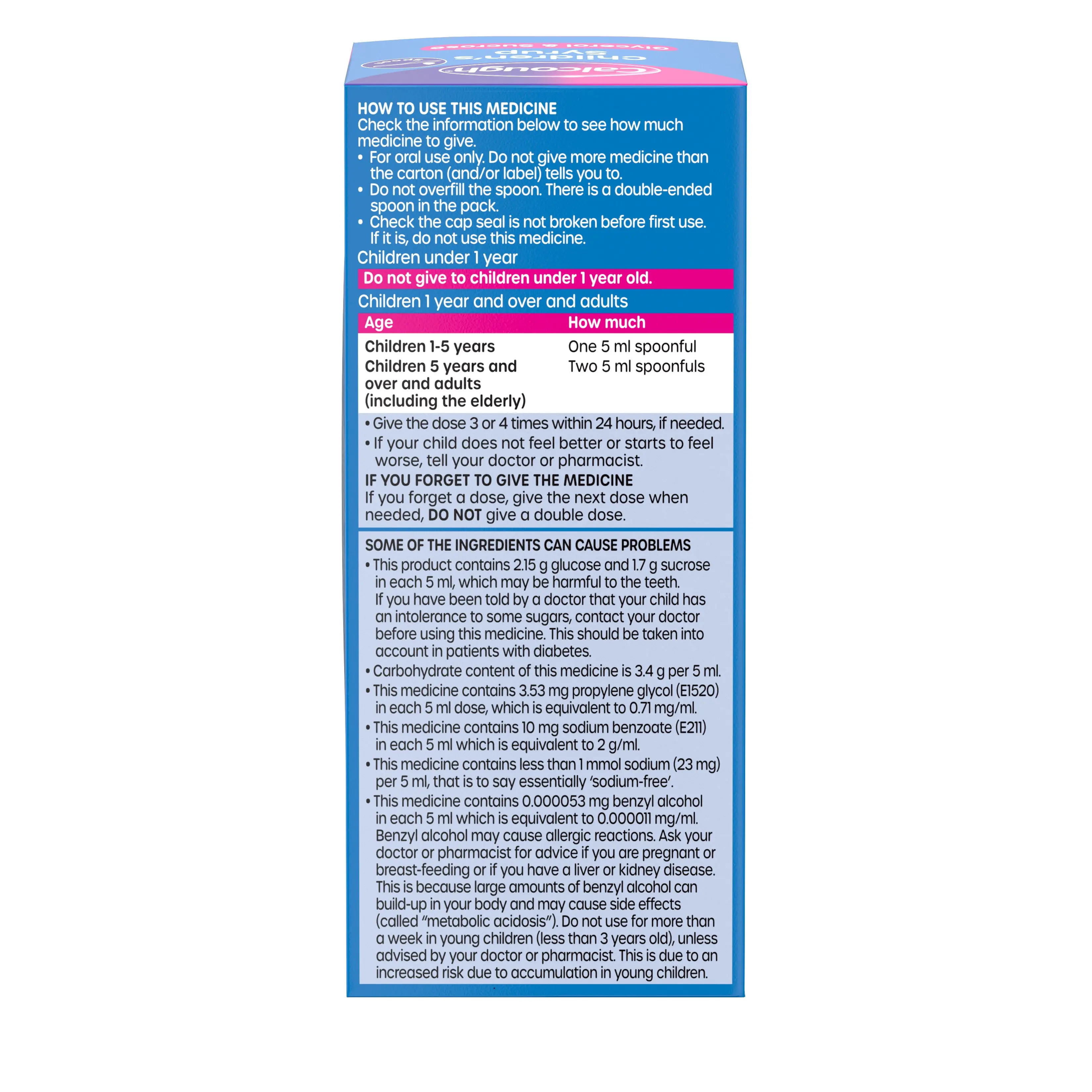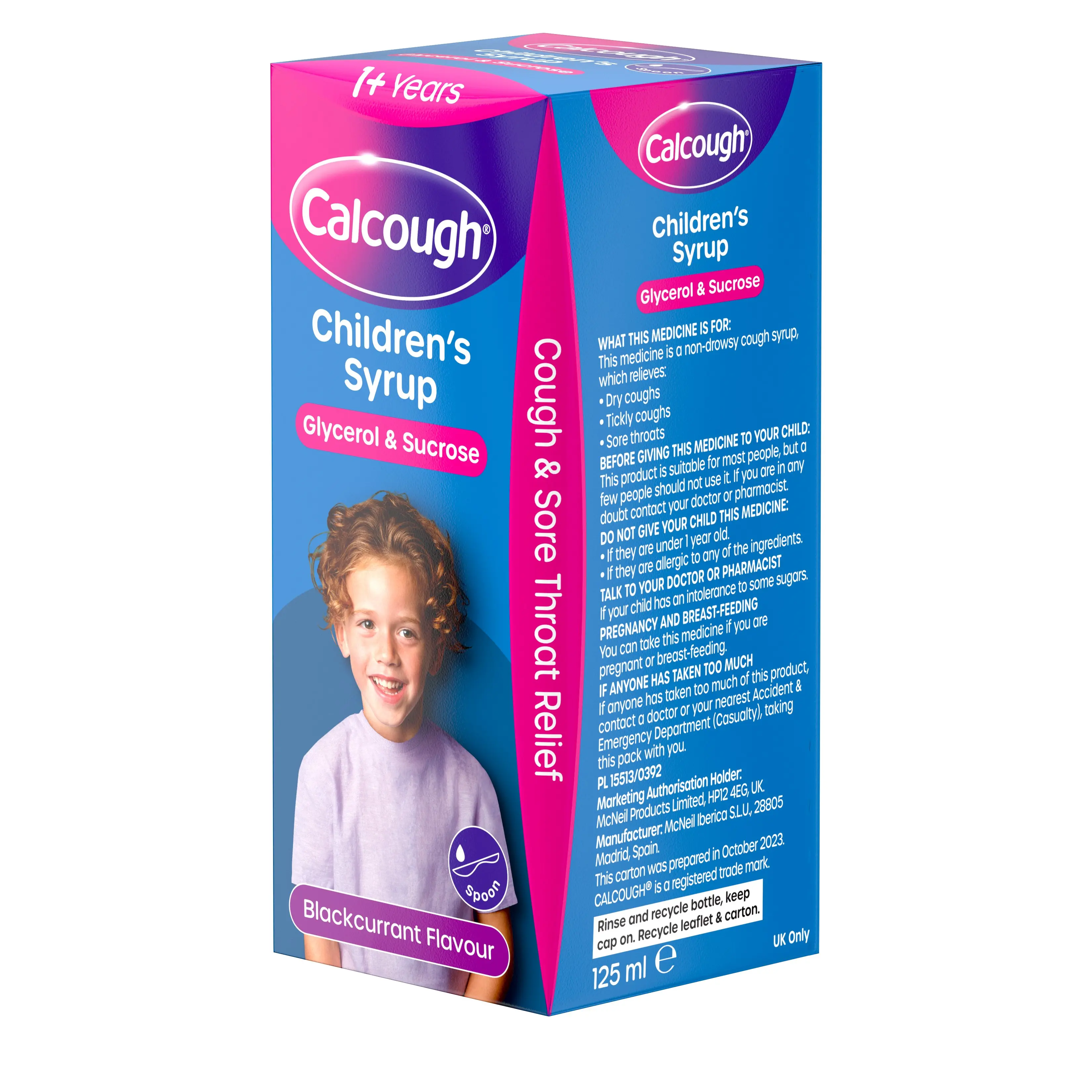 Active ingredients in each 5 ml of medicine are: Glycerol 0.75 ml and Sucrose 1.7 g. Also contains: Citric acid monohydrate, sodium benzoate (E211), anthocyanin, blackcurrant Flavour 1740.7107 IFF (containing benzyl alcohol and propylene glycol (E1520)), blackcurrant Juice 1740.1436 IFF (containing benzyl alcohol and propylene glycol (E1520)), liquid Glucose, purified Water