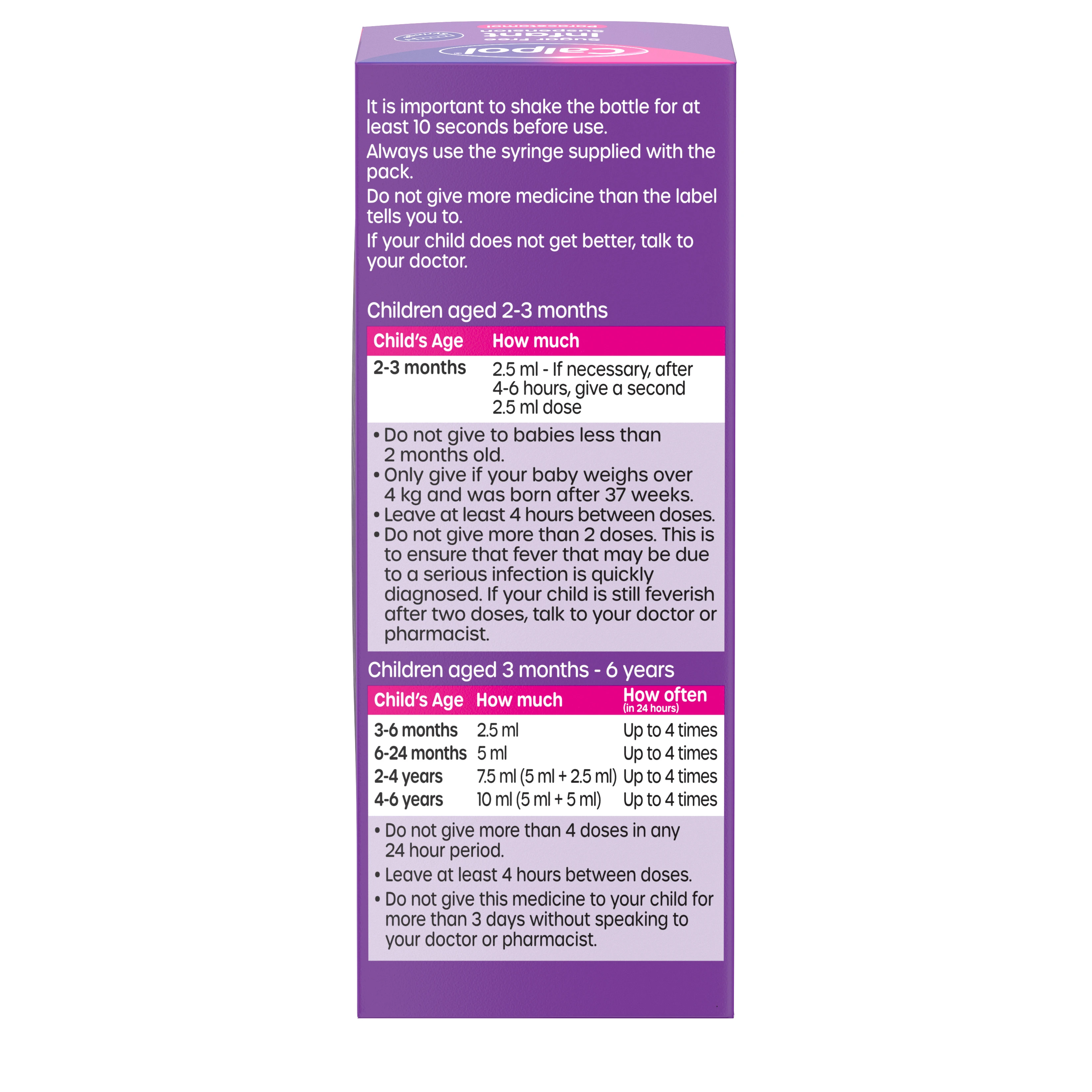 Dosage for the relief of pain and other causes of fever in babies aged 2-3 months (if your baby weighs over 4kg and was born after 37 weeks); 2.5ml. If necessary, give a second dose after 4-6 hours.