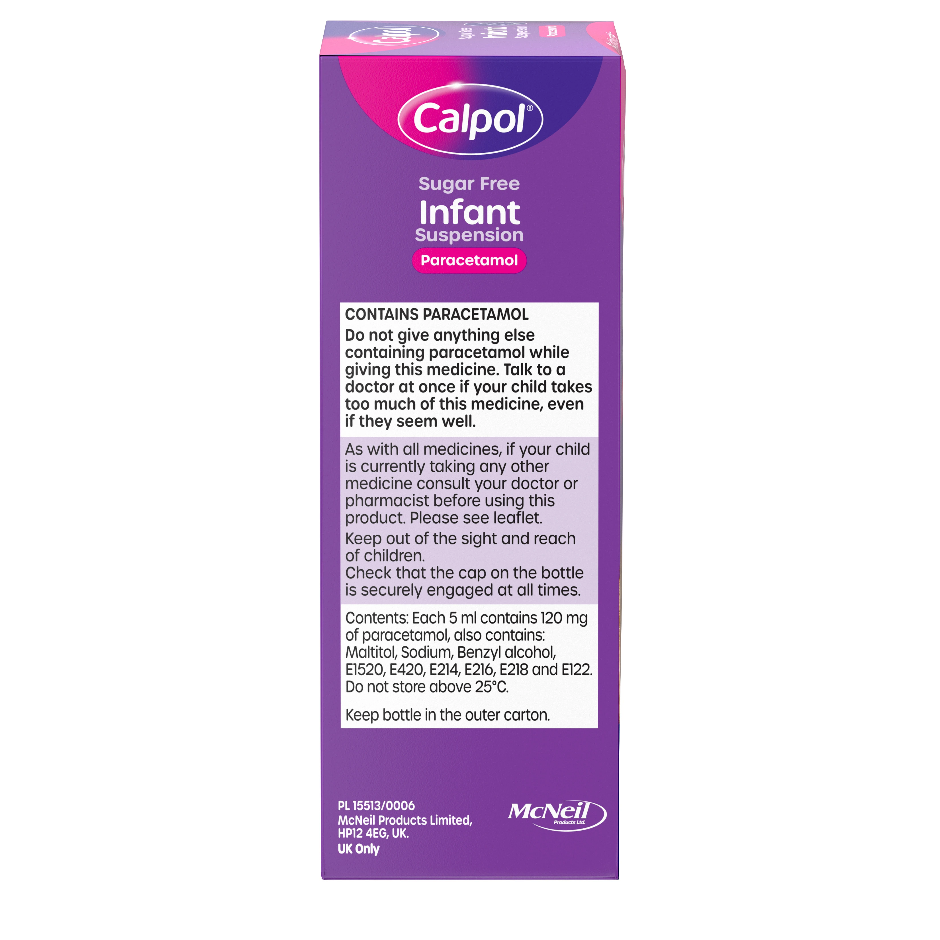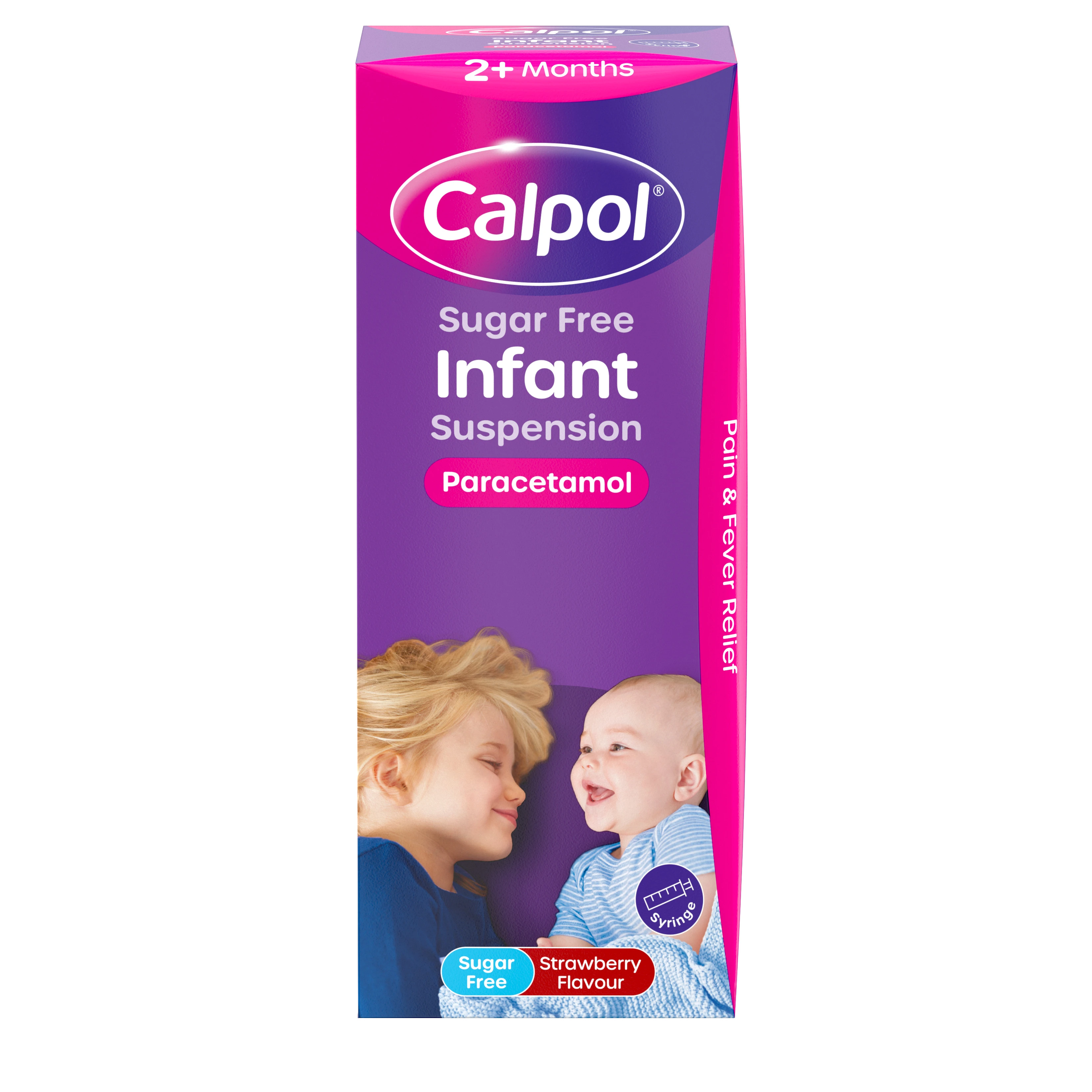 The paracetamol in CALPOL® Sugar Free Infant Suspension is used to relieve pain and/or bring down fever (raised temperature) in many conditions including post-immunisation fever, cold and flu symptoms, teething, headache, sore throat, earache and other aches and pains.