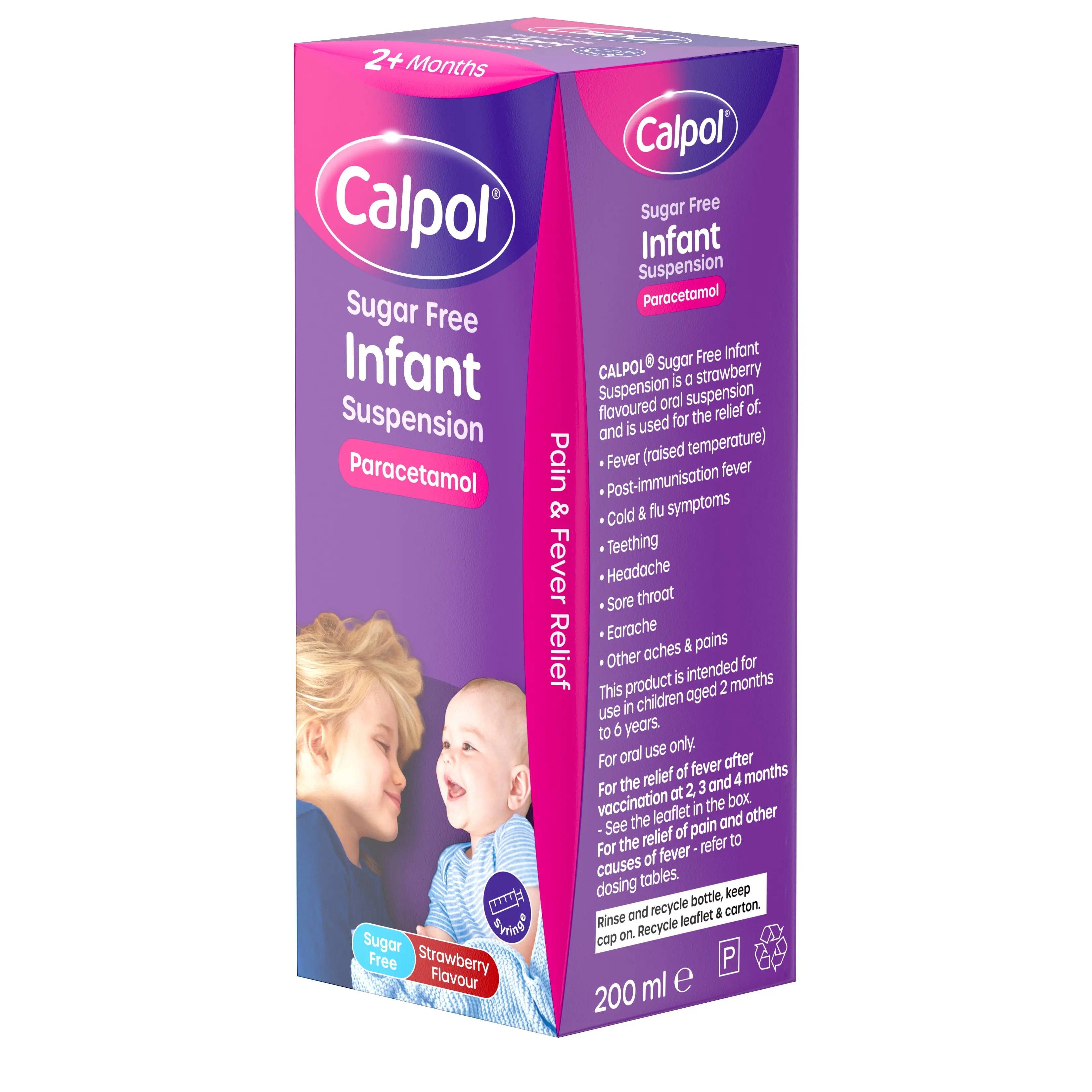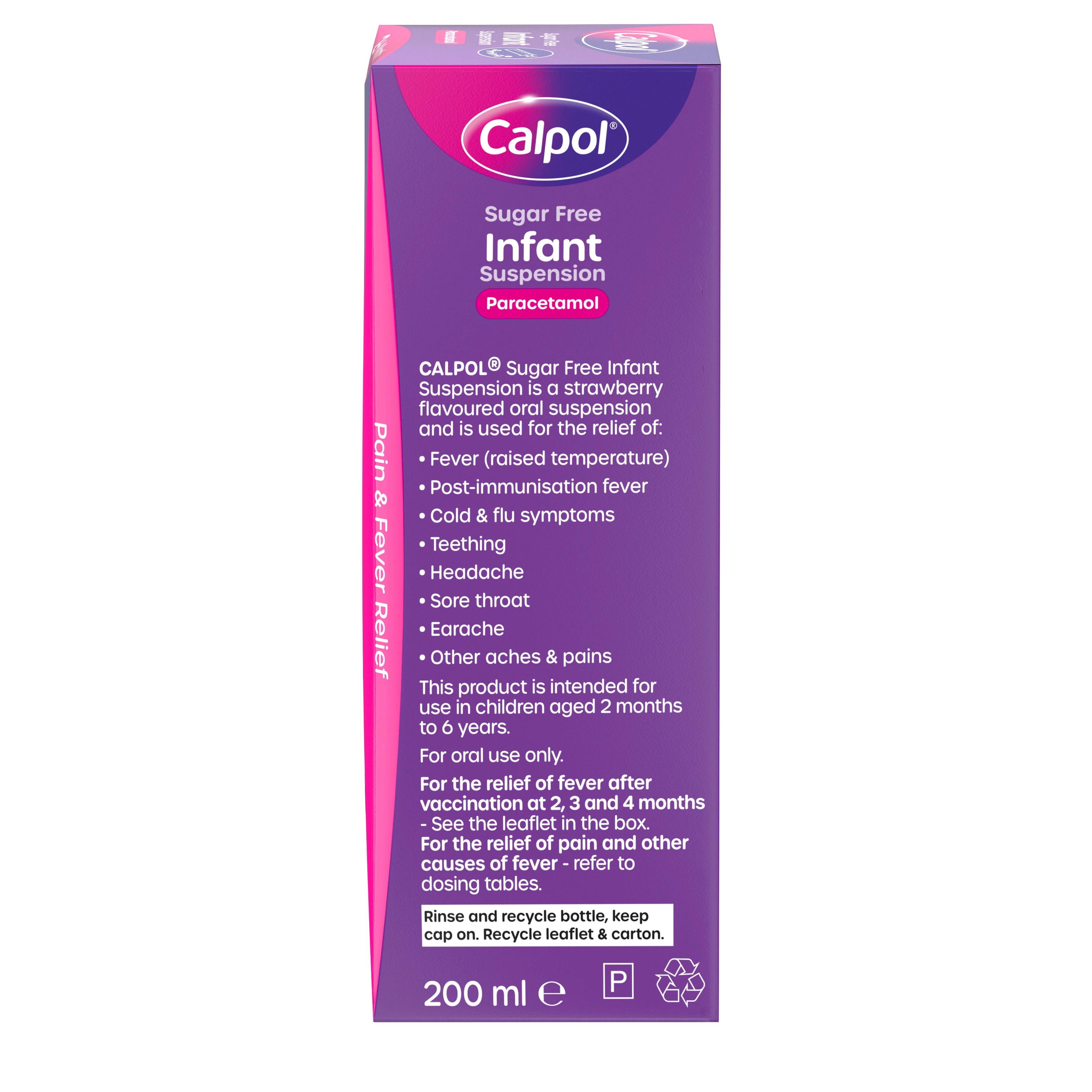 CALPOL® Sugar Free Infant Suspension 200ml is used to relieve pain and / or bring down fever (high temperature) in many conditions including post-immunisation fever, teething, headache, cold and flu, toothache, earache, sore throat and other aches and pains.