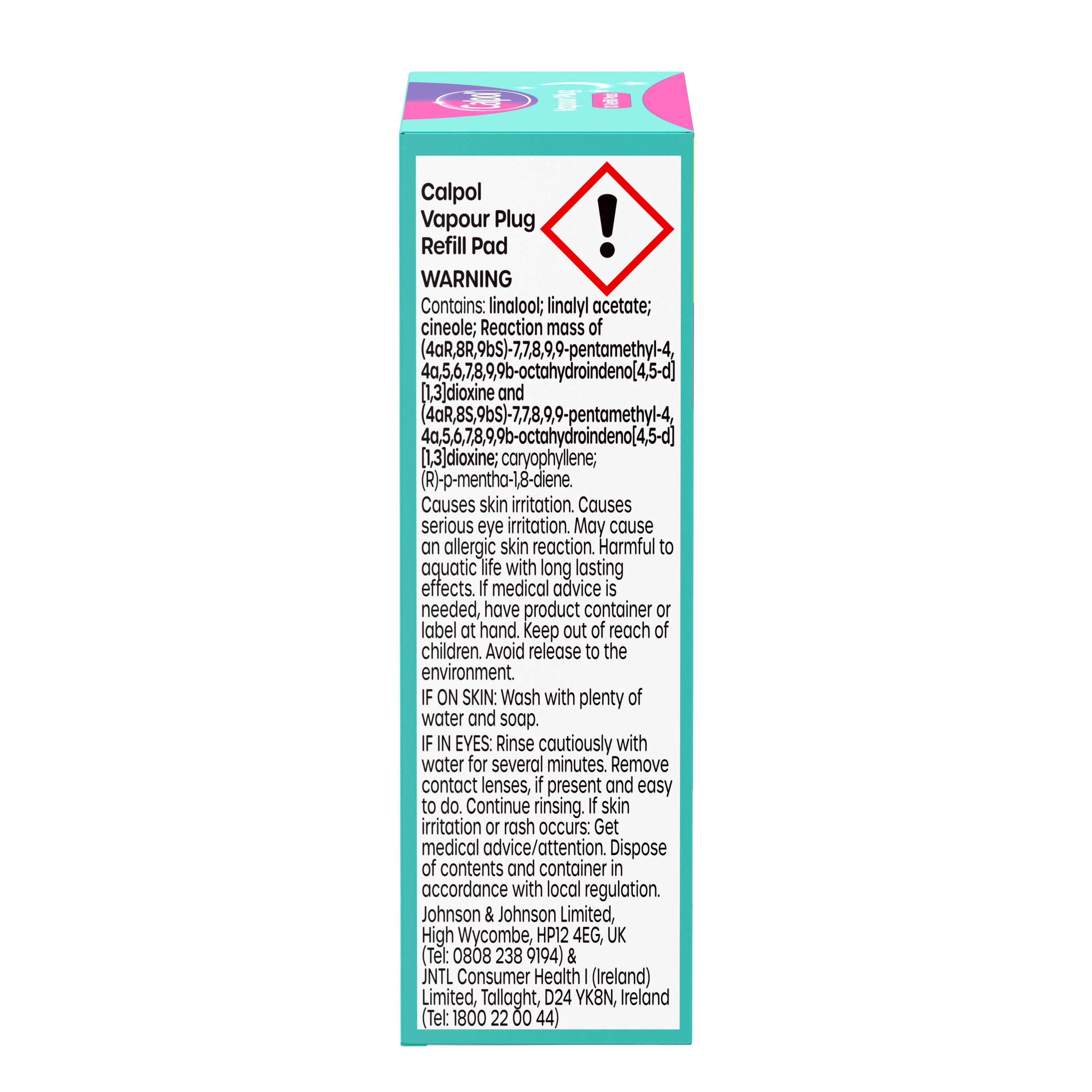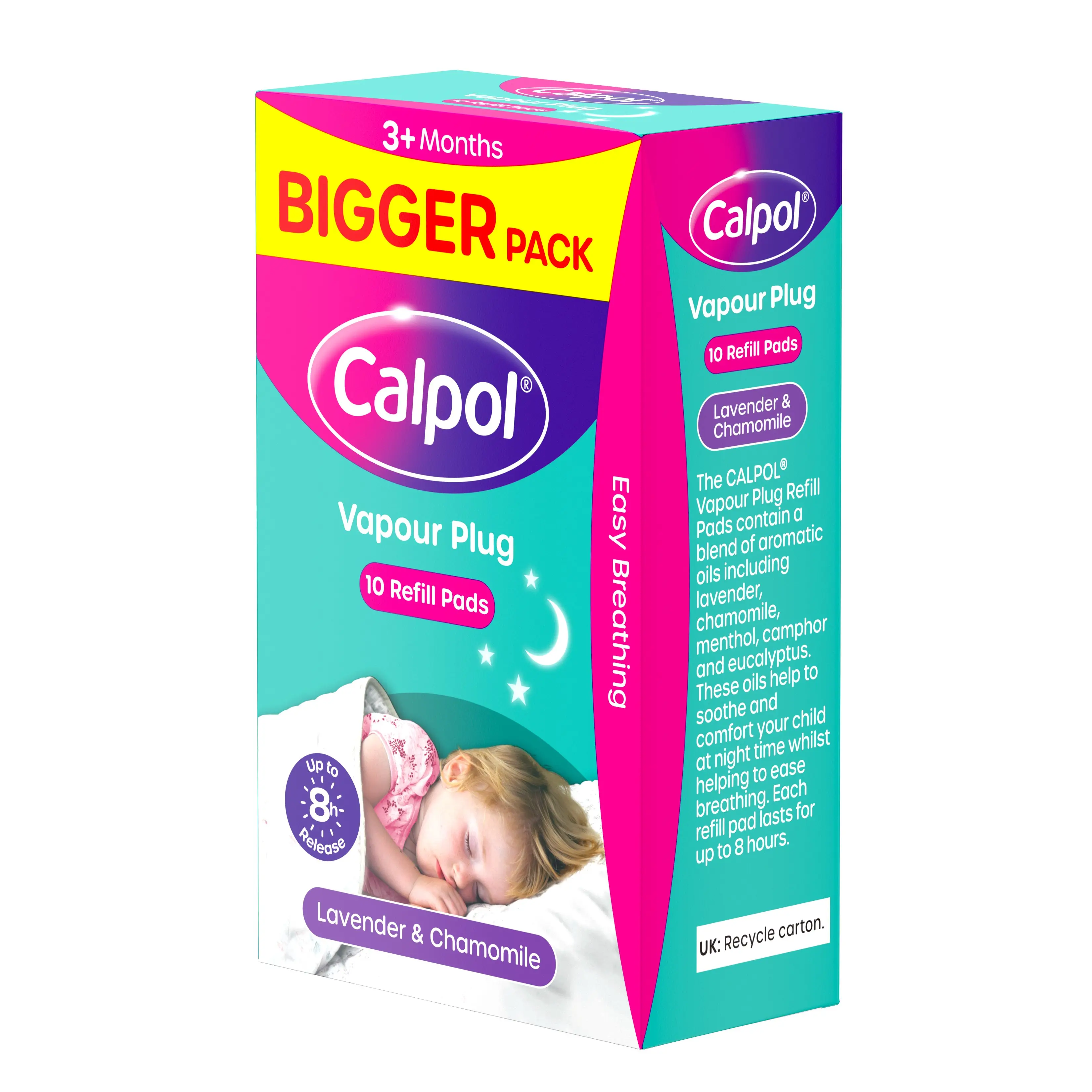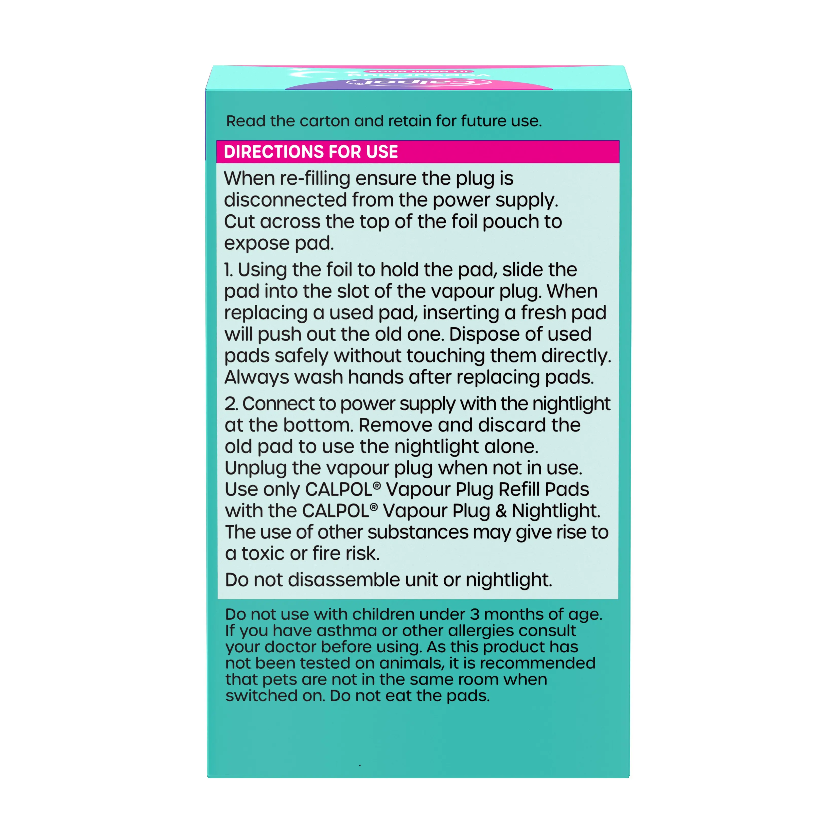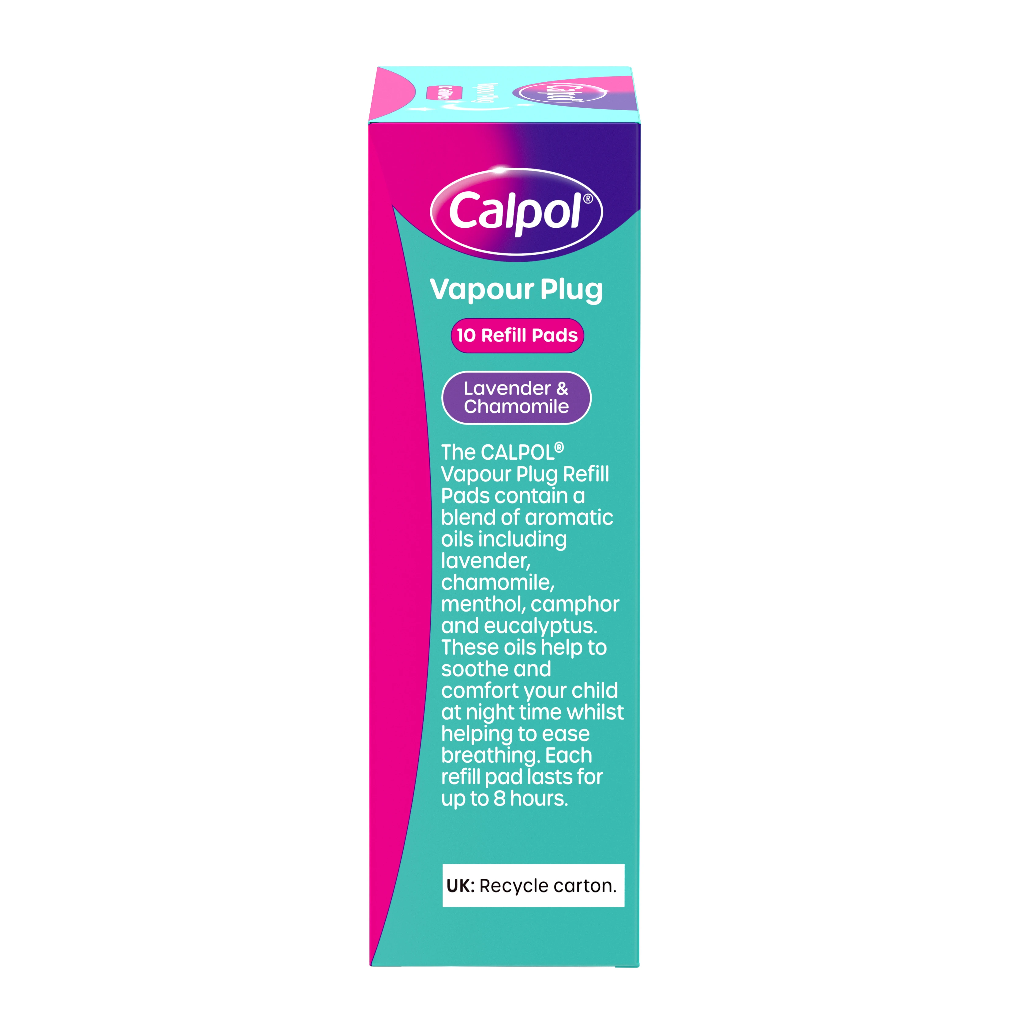 Refill pads for the CALPOL® Vapour Plug & Nightlight. Refill your Vapour Plug with these pads, which contain a blend of aromatic oils including lavender, chamomile, menthol and eucalyptus. These oils help to soothe and comfort your child at night time whilst helping to clear and ease breathing at night.