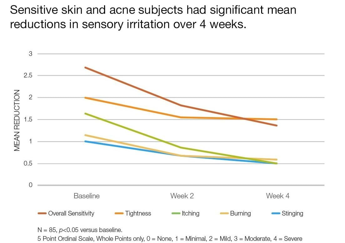 Clinical study on 85 subjects, 18-70 years old with clinically sensitive and acne-prone skin