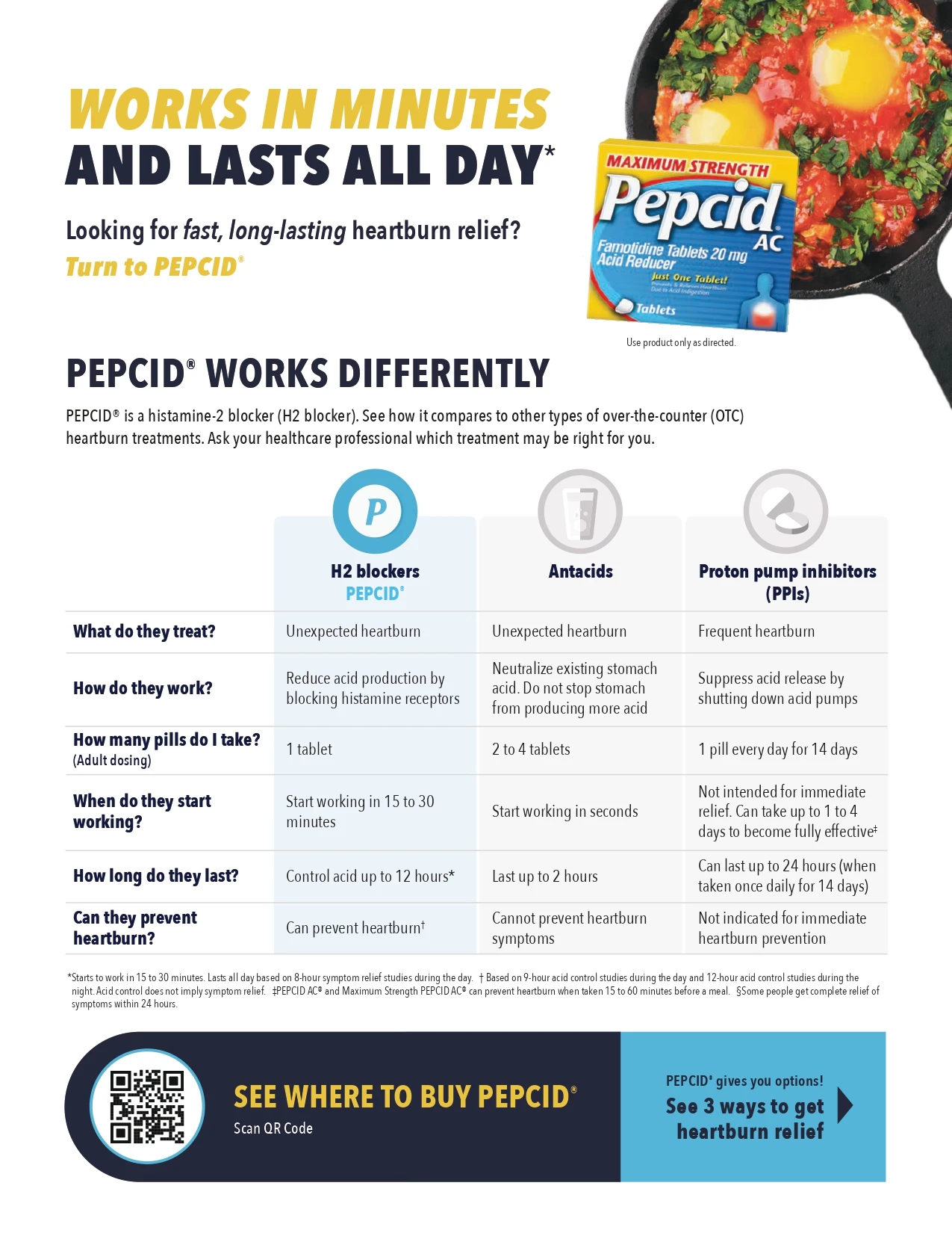Patients looking for fast, long-lasting heartburn relief? Show them how PEPCID®, a histamin receptor-2 blocker (H2-blocker), works in minutes and lasts all day.*
