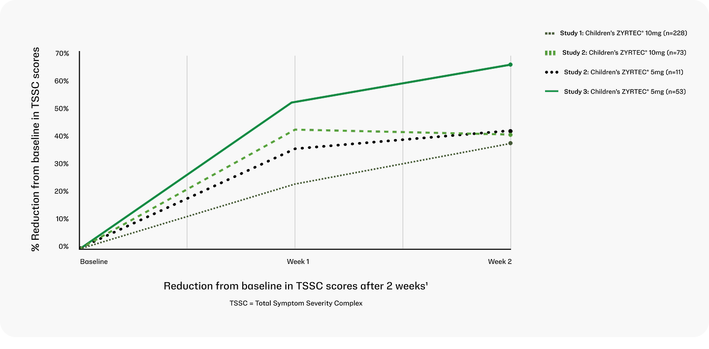 Reference: 1. Unden AE, Przygod P, Pla L, Lin CL, et al. Regular use of cetirizine demonstrates consistent relief from symptoms of seasonal allergic rhinitis in children. J Allergy Clin Immunol. 2011;127(suppl 2):AB202.