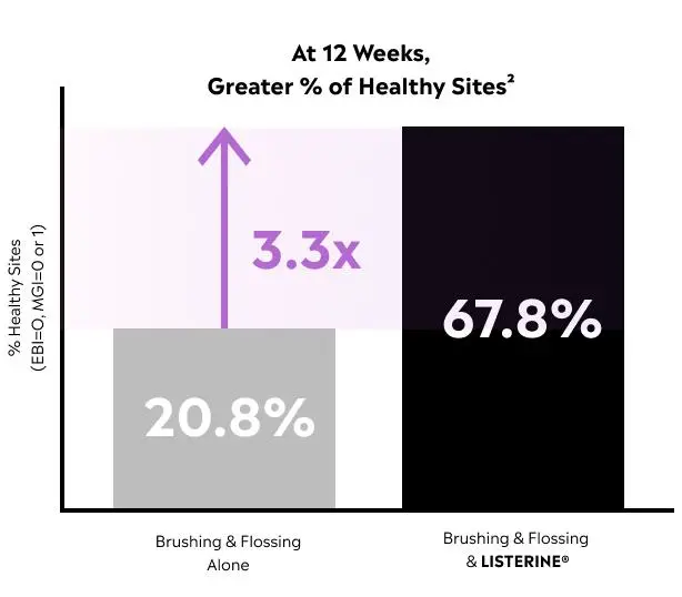 The study shows after 12 weeks, the addition of twice daily use of LISTERINE® Cool Mint Antiseptic Mouthwash after brushing and flossing: