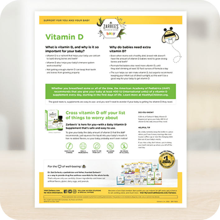 One serving of Zarbee’s® Baby Vitamin D Drops [Links to: Product Detail Page] delivers the daily 400 IU of vitamin D recommended by the AAP.2
