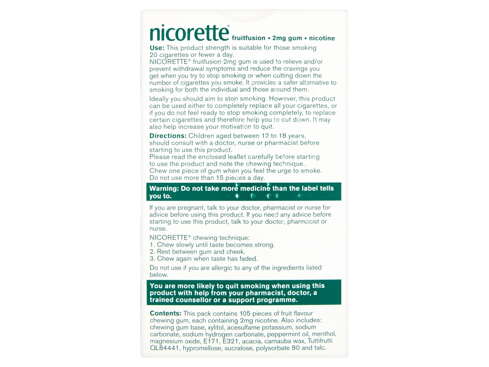 Adults and Children over 12 years of age: The strength of gum to be used will depend on the smoking habits of the individual. In general, if the patient smokes 20 or less cigarettes a day, the 2mg nicotine gum is indicated. If the patients smokes more than 20 cigarettes a day, the 4mg gum will be needed to meet the withdrawal of the high serum nicotine levels from heavy smoking. Nicorette gum should be used whenever the urge to smoke is felt or to prevent cravings in situations where these are likely to occur. Smokers willing or able to stop smoking immediately should initially replace all their cigarettes with the gum and as soon as they are able, reduce the number of gums used until they have stopped completely. Smokers aiming to reduce cigarettes should use Nicorette gum, as needed, between smoking episodes to prolong smoke-free intervals and with the intention to reduce smoking as much as possible. As soon as they are ready smokers should aim to quit smoking completely. Maximum daily dose: 15 pieces per day.
