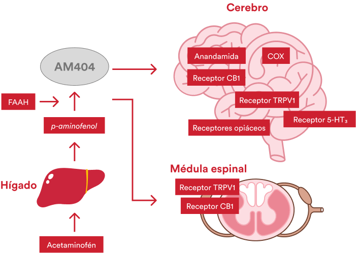 Figura 1: Mecanismo analgésico del Acetaminofén. El Acetaminofén es metabolizado a p-aminofenol, que fácilmente atraviesa la barrera hematoencefálica y se convierte a AM404 por medio de FAHH. El AM404 actúa principalmente tanto en el cerebro como en la médula espinal por medio de COX, anandamida y los receptores de CB1, TRPV1, opiáceos y 5-HT3. AM404: N-Acilfenolamina; FAAH: Hidrolasa amida de ácidos grasos; COX: Ciclooxigenasa; CB1: Cannabinoide 1; TRPV1: Receptor transitorio potencial vainilloide 1.Gráfica adaptada de: Ohashi N, et al. Efecto analgésico del paracetamol: una revisión de los mecanismos de acción conocidos y novedosos. Front Pharmacol 2020;11: 580289. doi: 10.3389/fphar.2020.580289.