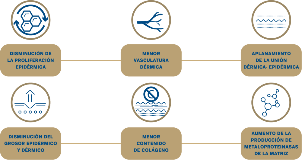 Fisiológicamente, el envejecimiento intrínseco de la piel conduce a:1,2