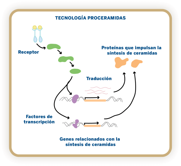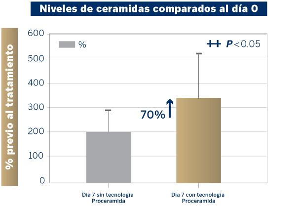 La tecnología ProCeramidas actúa a nivel celular, aumentando la transcripción de proteínas involucradas en la síntesis de ceramidas e induciendo la diferenciación de los queratinocitos, resultando en un incremento de hasta 70% de todo el espectro de ceramidas, comparado con piel tratada sin la tecnología.3