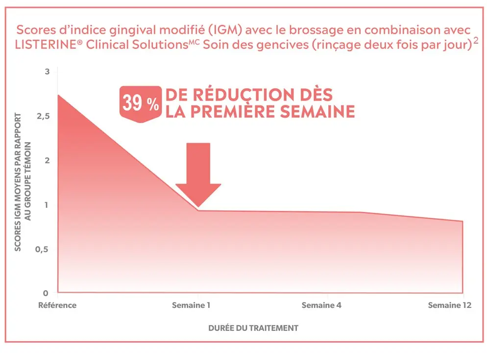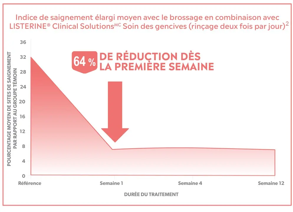 Il a été cliniquement prouvé que sa nouvelle formule contenant plus de chlorure de zinc réduit le saignement des gencives d’une semaine par rapport au brossage seul2