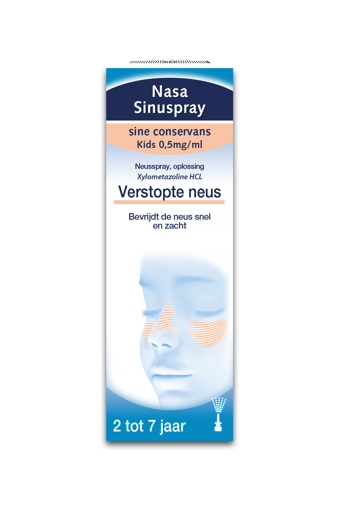 Nasasinuspray® sine conservans Junior 0,5 mg/ml is bestemd voor kinderen tussen 2 en 7 jaar. In eerste instantie wordt aanbevolen om de neus te spoelen met een zoutoplossing. Volgend op de neusspoeling kan bij aanhoudende congestie het decongestivum worden gebruikt.