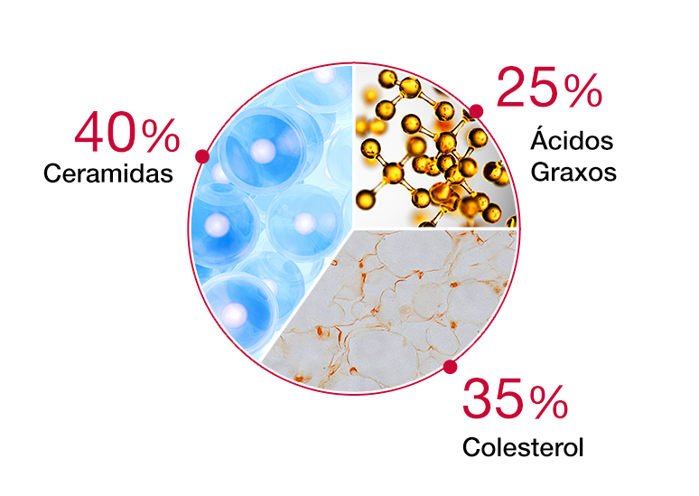 A matriz lipídica cutânea é formada por 40% de ceramidas (1), 35% de colesterol (2) e 25% de ácidos graxos (3).