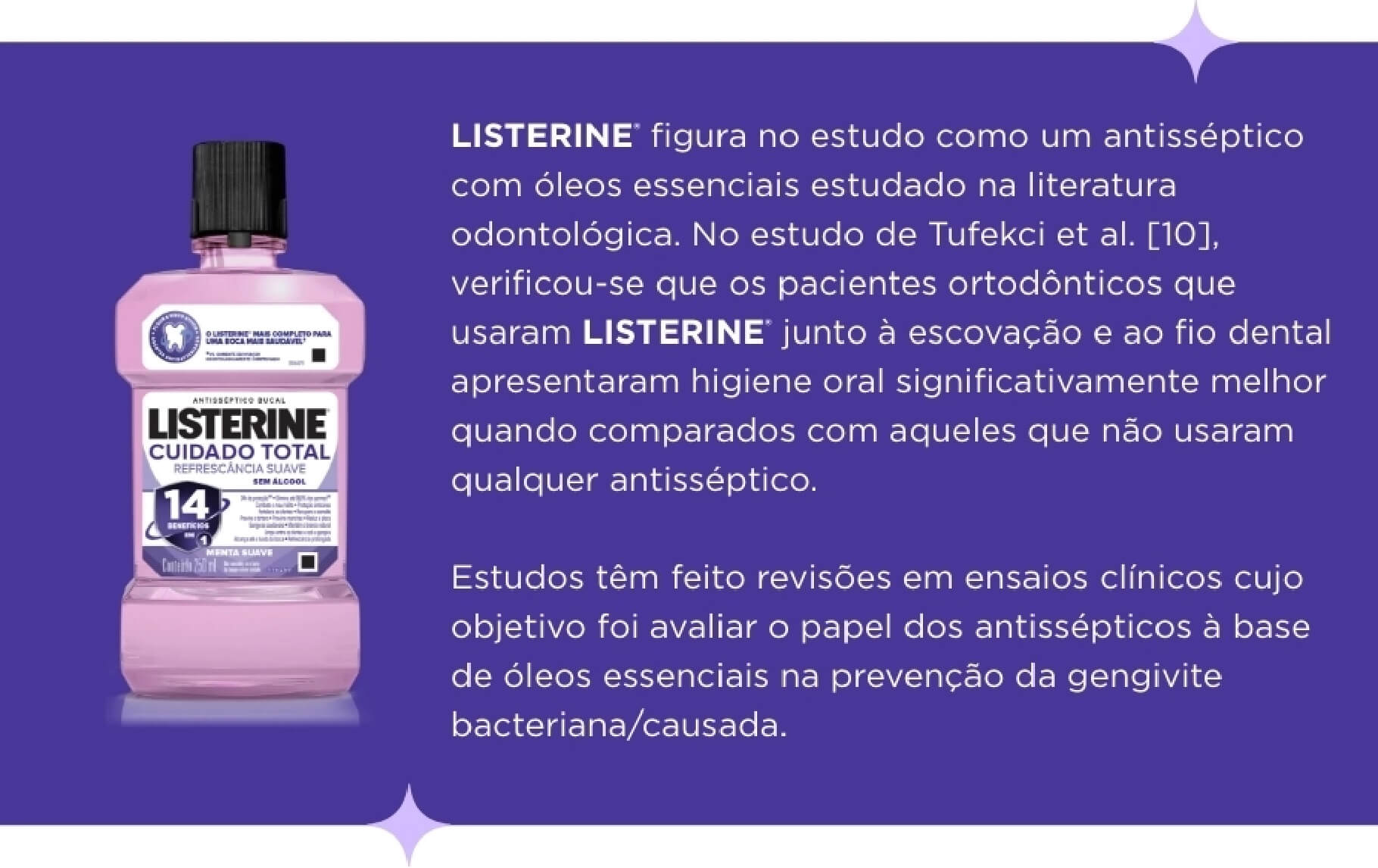 Referências:1. Role of Essential Oil-Based Mouthwashes in Controlling Gingivitis in Patients Undergoing Fixed Orthodontic Treatment. [Internet] Disponível em