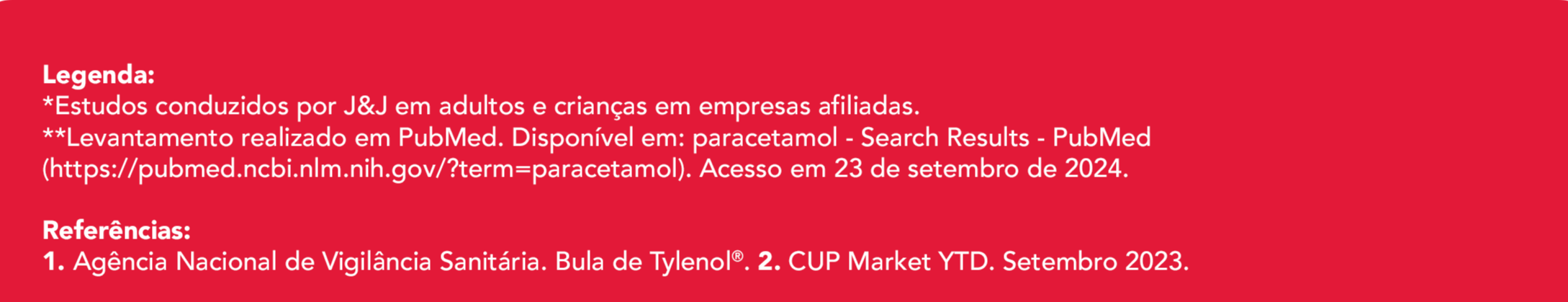 TYLENOL® PARACETAMOL. TYLENOL®DC PARACETAMOL E CAFEÍNA. MEDICAMENTO DE NOTIFICAÇÃO SIMPLIFICADA RDC ANVISA Nº 576/2021. AFE nº: 1.05.721-1. INDICADO PARA O TRATAMENTO DE DOR E FEBRE. ADVERTÊNCIAS: NÃO USE TYLENOL® JUNTO COM OUTROS MEDICAMENTOS QUE CONTENHAM PARACETAMOL, COM ÁLCOOL OU EM CASO DE DOENÇAS GRAVE DO FÍGADO. TYLENOL®DC É UM MEDICAMENTO. SEU USO PODE TRAZER RISCOS. PROCURE O MÉDICO E O FARMACÊUTICO. LEIA A BULA. SAC 0800 728 6767 OU SERVIÇO AO PROFISSIONAL 0800 702 3522. DATA DE APROVAÇÃO: SETEMBRO/2025. ©Kenvue Brasil, 2025. “SE PERSISTIREM OS SINTOMAS O MÉDICO DEVERÁ SER CONSULTADO”.