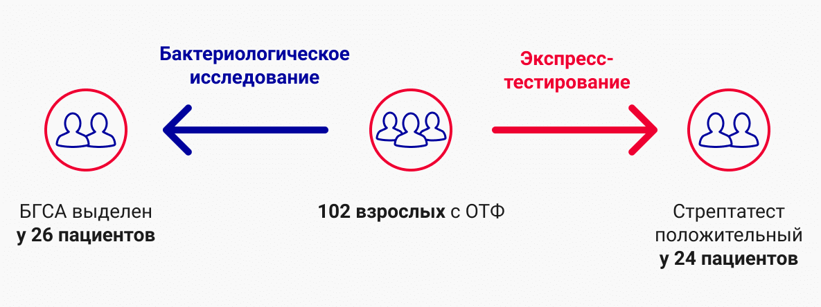 Из 26 взрослых пациентов с БГСА-этиологией ОТФ, подтвержденной при проведении бактериологического исследования, Стрептатест был положительный в 24 случаях, в 2 – отрицательный.