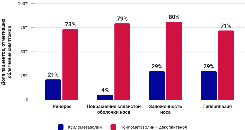 Доля пациентов с легкими симптомами ринита или с полным исчезновением симптомов через 3 дня после начала лечения ксилометазолином или комбинации ксилометазолина с декспантенолом