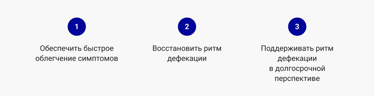 Лечение хронического запора у этой группы пациентов — многоэтапная стратегия. В ее основе три цели: