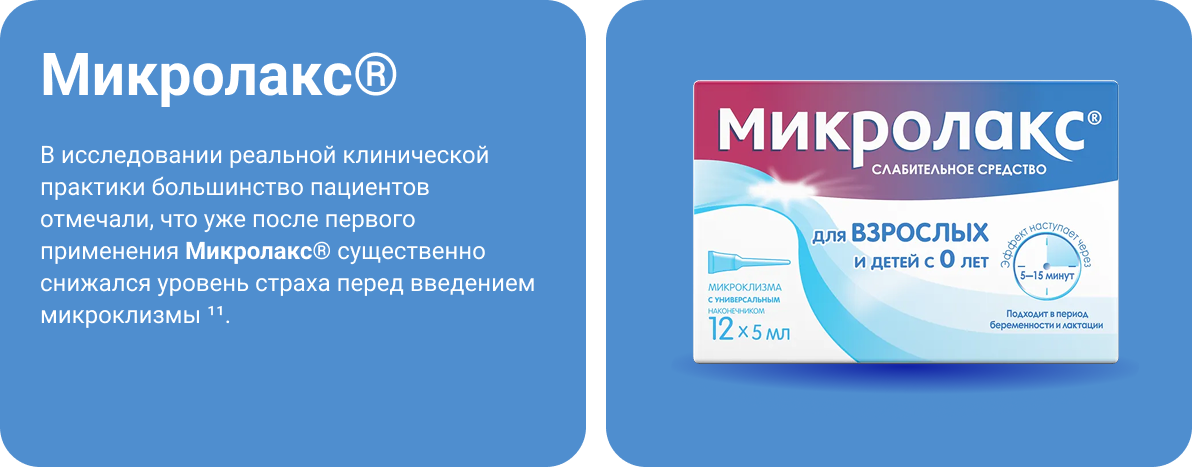 На старте терапии важно устранить эпизод запора. На этом этапе показаны слабительные с предсказуемым и быстрым началом действия*. Предпочтительно использовать средства местного действия или с минимальным системным воздействием, например микроклизмы Микролакс®7.
