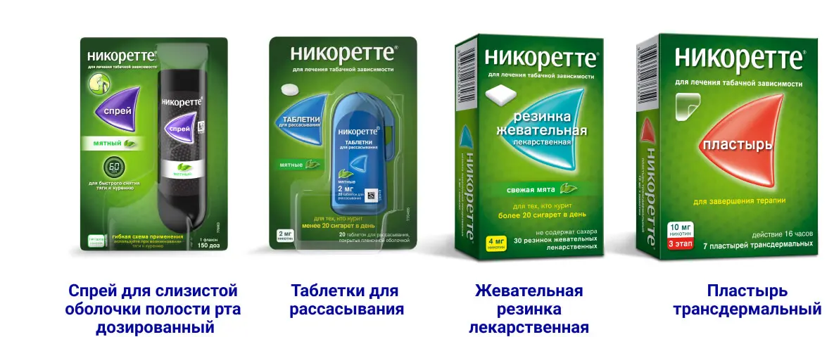 Никоретте® выпускается в нескольких лекарственных формах: спрей для слизистой оболочки полости рта, таблетки для рассасывания, жевательная резинка и трансдермальный пластырь3,14-16.